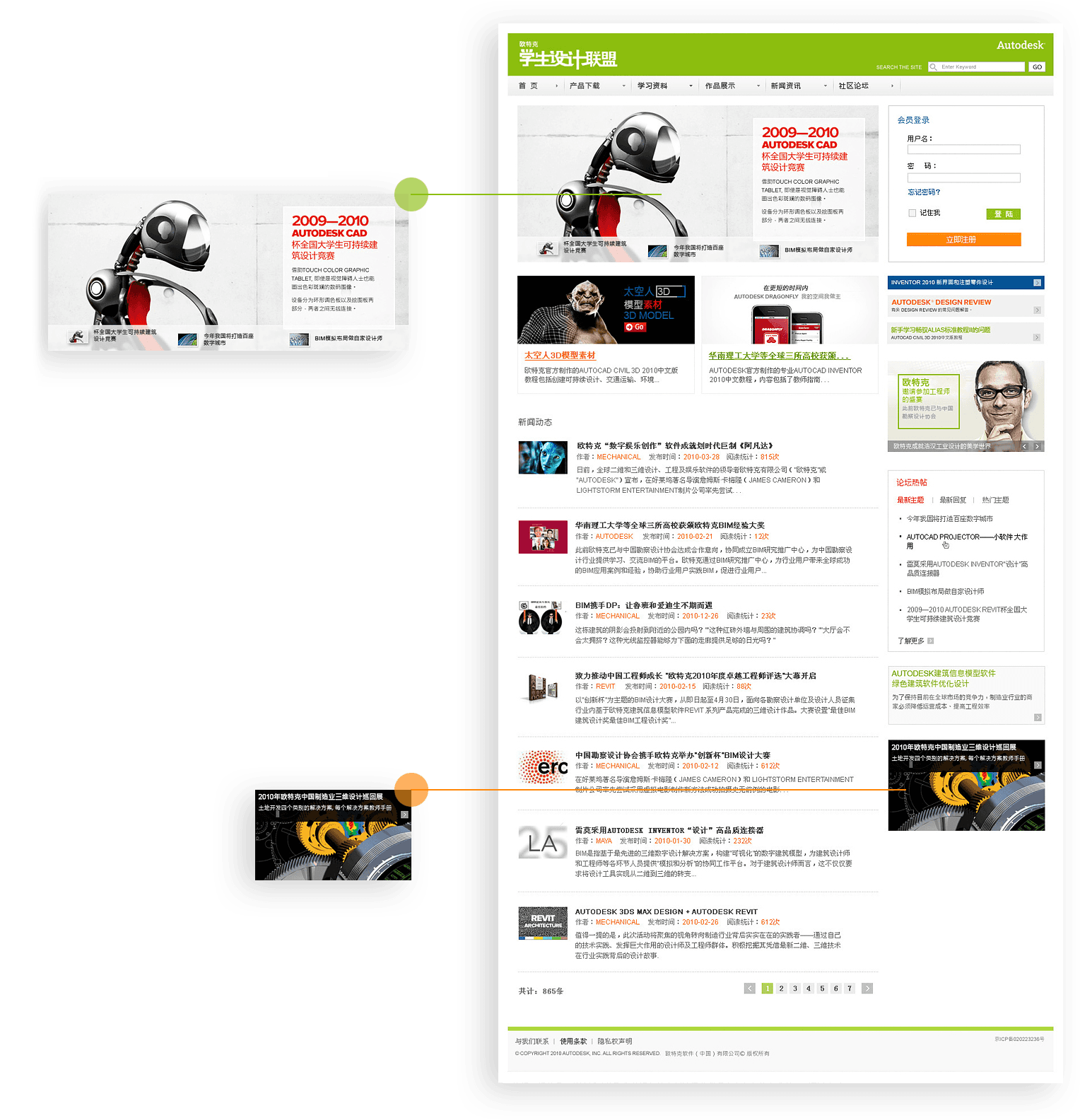 欧特克学生设计联盟网站以平台运营思路为核心,设置多个主题活动、营销互动功能模