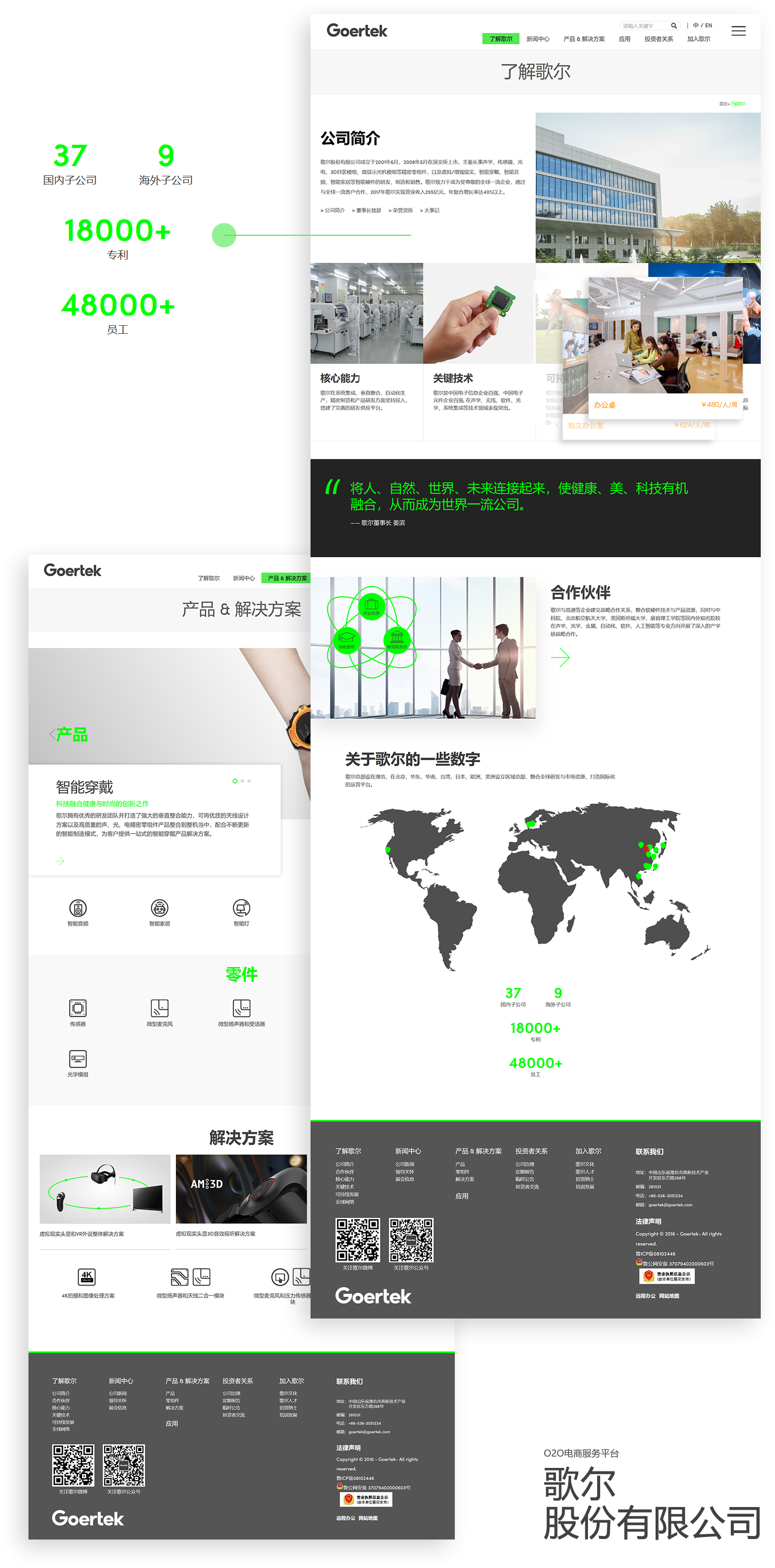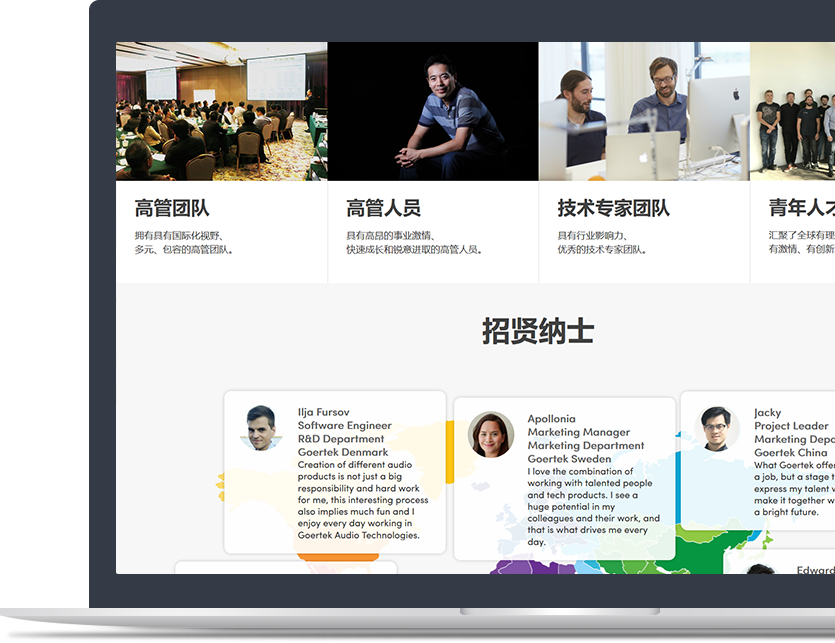 歌尔研发布局全球,在美国、日本、韩国、丹麦、北京、青岛、深圳、上海、南京、台湾等地分别设立了研发中心,以声光电为主要技术方向,通过集成跨领域技术提供系统化整体解决方案。 我们一起创造 We make it together