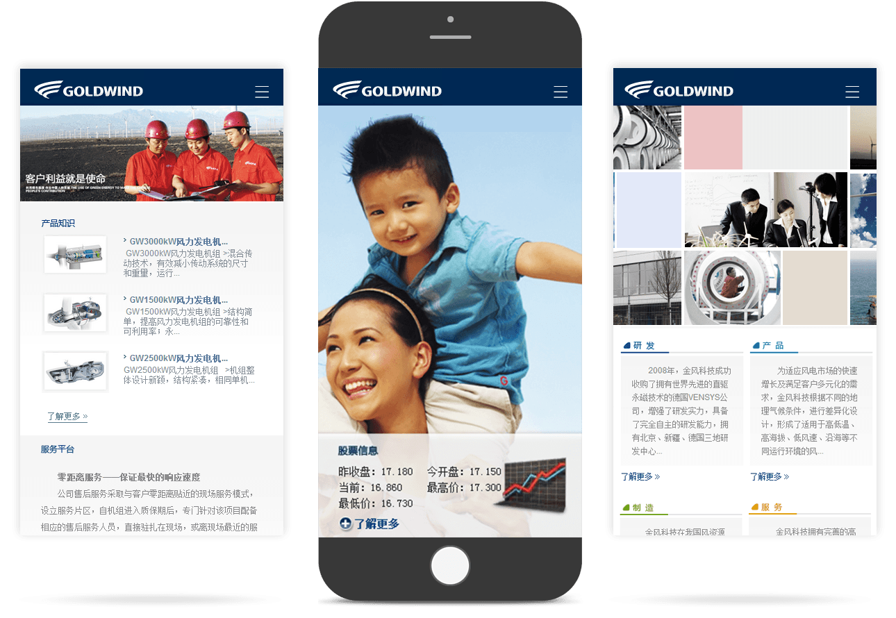 网站整体设计契合企业的领域属性,兼顾品牌与产品双重需求,视觉效果简洁大气,成 功塑造金风科技创新、科技、国际化的品牌形象。