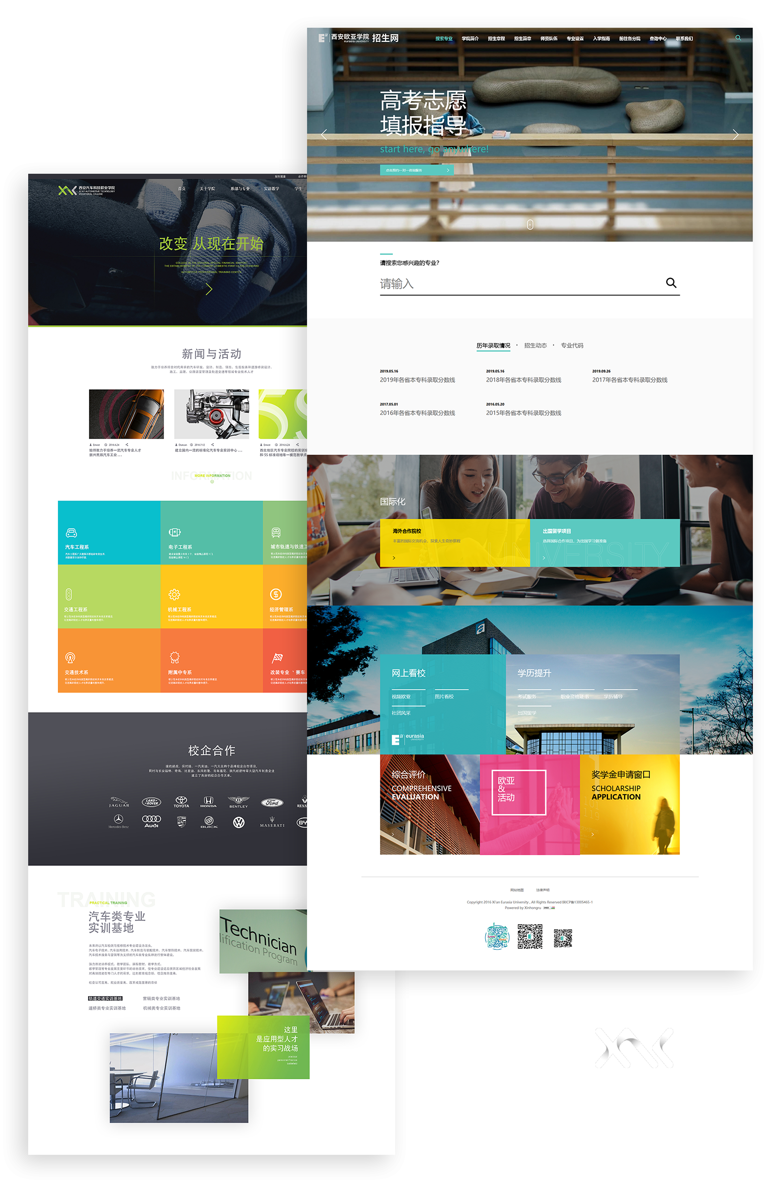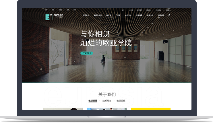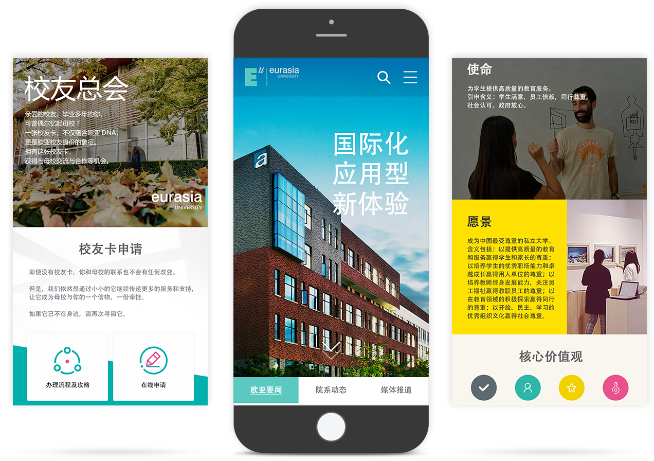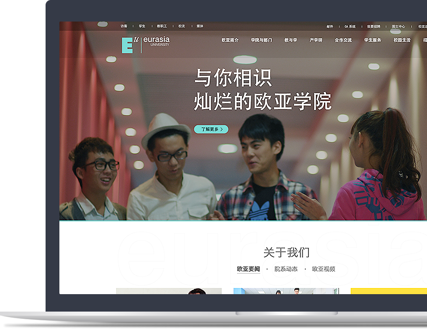 以官网为入口,实现各学院网站一站式管理,进行子站权限设置,统计所有站点数据。所有子站遵循西安欧亚学院VI视觉规范,并在此基础上针对品牌定位与调性进行个性化设计,突出各学院差异。