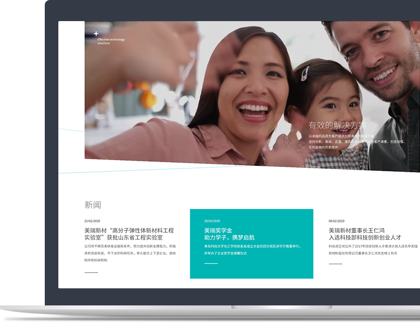 在保证视觉效果的同时简化所有繁冗设计,版块划分采用不规则图型, 从视觉体验和使用体验两个层面提升用户体验,用孜孜不倦的匠心和永续创新的产品,不断谱写新材料领域的新篇章。