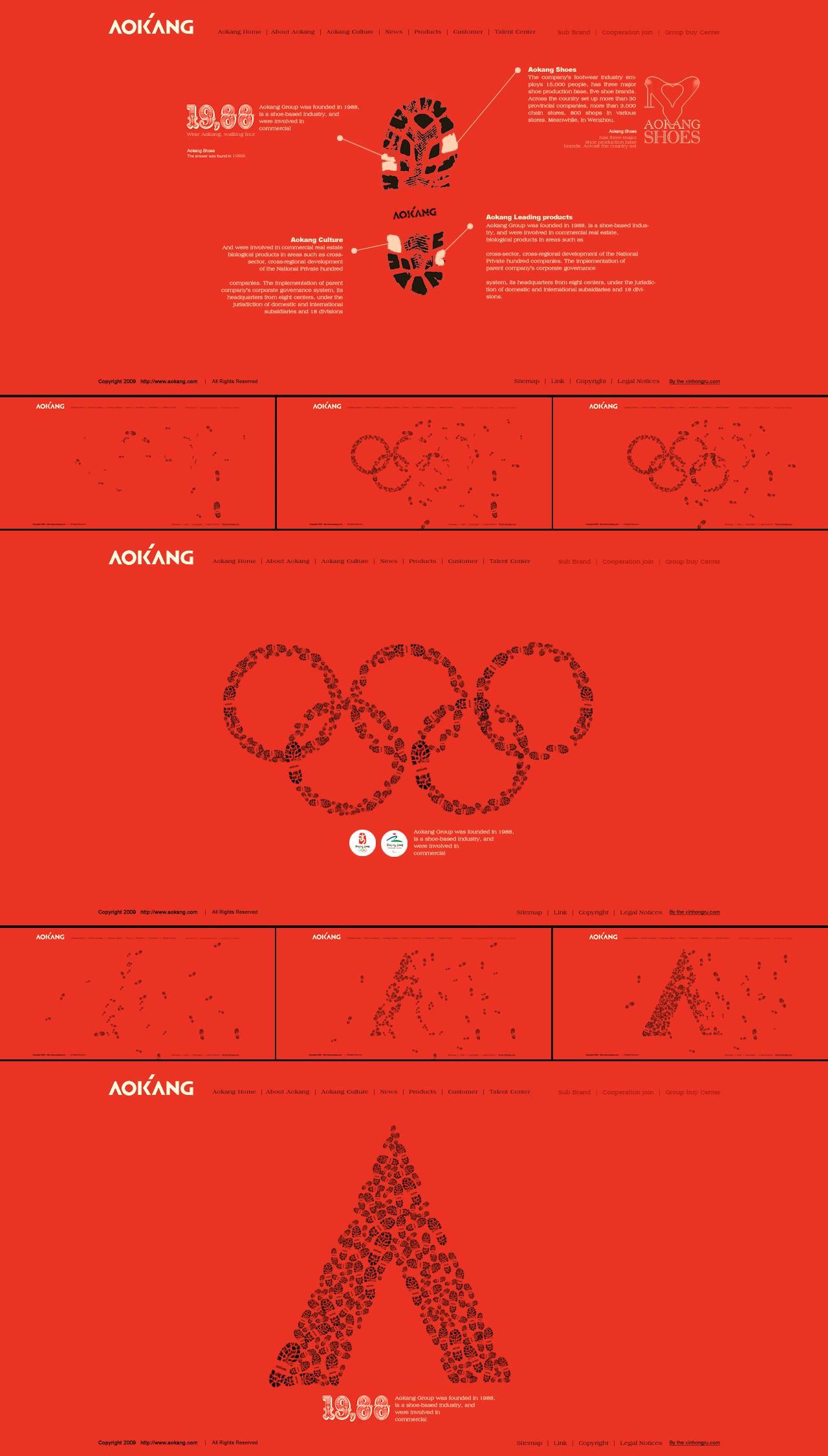 如图所示,九游平台根据奥康集团所在行业优势,将企业发展核心配合鞋印动态展示,生动直观;又结合奥康集团作为2008年奥运赞助商这一特征,以鞋印组成奥运五环,放大其奥运精神;最终,鞋印组合为奥康集团标志性logo,升华企业文化。
